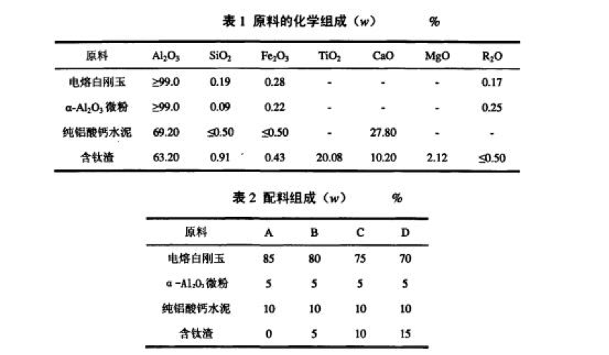 試驗用主要原料為電熔白剛玉、活性葉舢203微粉、純鋁酸鈣水泥、含二氧化鈦工業(yè)渣以及AC.H.Z200 等有機添加劑,其化學(xué)組成如表l所示。
