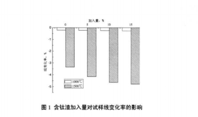 圖1所示為含鈦渣的/JnA.量對試樣熱處理后線(xiàn)變化率的影響。由圖l可以看出,隨著(zhù)含鈦渣加入量的 增加,經(jīng)1000*Cx3 h熱處理后的試樣的線(xiàn)變化率相差不大,都存在0.2%左右的收縮。但經(jīng)1500"Cx3 h 熱處理后的試樣的線(xiàn)變化率則相差較大,隨著(zhù)含鈦渣加入量的增加而收縮增大,主要是因為含鈦渣的加 入促進(jìn)了材料的燒結,加入量愈大收縮愈大。但含鈦渣的加入量由10%增加到15%后,試樣的線(xiàn)變化率 變化趨緩,可能由于鈦酸鋁的大量形成,其膨脹抵消了部分的燒結收縮。