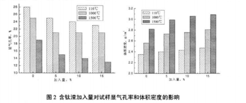 圖2所示為音鈦渣加入量對試樣顯氣孔牢、體積密度的影響。由圖可以看出.在熱處理后,試樣的 顯氣孔率和體積密度隨者含鈦渣的增加而呈現明顯的變化規律。試樣的顯氣孔率隨含鈦渣的增加而下 降,體積密度隨著(zhù)含鈦渣的增加而上升。添加了古鈦渣的試樣相比空白樣而占,其顯氣孔牢有明顯的下 降,體積密度顯著(zhù)增加.尤其是在1500℃的高溫處理后.舍釷渣試樣和空白樣的顯氣孔率和體積密度差 異明顯,這與上部分對試樣的線(xiàn)盤(pán)化率的影響分析相對應。隨著(zhù)熱處理溫度的升高,試樣的顯氣孔率減 小,體積密度相應增大,明顯是含鈦渣的促燒原因。