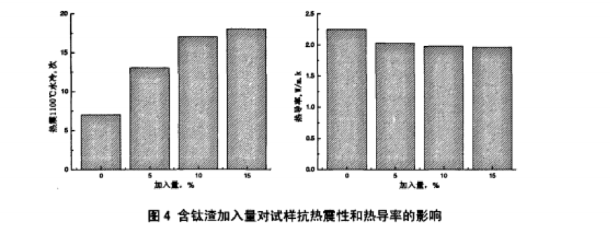 圖4所示為含鈦渣添加量對試樣抗熱震性和1000℃時(shí)熱導率的影響。由圖可以看出,含鈦渣的加入 明顯提高了試樣的抗熱震性,降低了試樣的熱導率,且隨著(zhù)含鈦渣加入量的增加熱震次數呈上升趨勢、 熱導率呈下降趨勢。但隨著(zhù)含鈦渣加入量增加,試樣的抗熱震性和熱導率改善趨緩,這可能是由于試樣 中雖有大量鈦酸鋁形成且量逐步增大,但試樣由于燒結好而致密化導致了未現明顯改善趨勢。