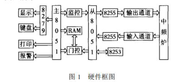本系統是以 2 片 8051 單片機外圍接口電路構 成的一個(gè)主從式雙工中頻電爐爐溫控系統 ,硬件總體框圖如 圖 1 所示。