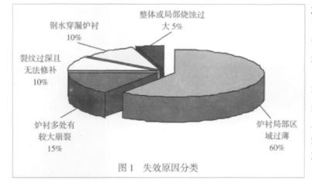 柳工機械股份有限公司鑄鋼廠(chǎng)每年熔煉鑄鋼鋼 液約 16000t,使用 6t 中頻爐和 3t 電弧爐熔煉碳鋼。長(cháng)期以來(lái)中頻爐使用一家知名的爐襯材 料供應商提供的爐襯材料,但一直存在著(zhù)中頻電爐爐襯壽命 偏短的問(wèn)題,平均爐襯壽命約 45 爐。爐襯壽命偏短 導致頻繁的修筑爐襯和烘爐,對生產(chǎn)組織和成本控 制都帶來(lái)了很不利的影響。為了解決這個(gè)問(wèn)題,從 2008 年 6 月開(kāi)始,我們開(kāi)始在延長(cháng)爐襯壽命方面進(jìn) 行探索。我們首先進(jìn)行了中頻爐煉鋼爐襯的失效原 因分析。 根據對 2008 年全年筑爐 25 次的失效統計,目 前的中頻電爐爐襯材料最主要缺點(diǎn)是裂紋傾向大,爐襯容易 因裂紋而導致多處崩裂、造成局部區域過(guò)薄而失效; 其次是中頻電爐爐襯下部燒蝕過(guò)快導致?tīng)t襯失效。失效原因 分類(lèi)見(jiàn)圖 1。