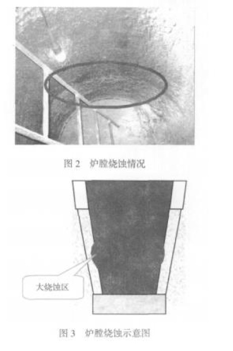 2009 年 2 月,我們與一家知名的爐襯材料供應 商共同按照我們提出的性能要求選擇了一種爐襯材 料并進(jìn)行首次工藝試驗。首次試驗爐襯壽命為 40 爐次,未達到 預期要求。分析原因為爐膛中下部局部燒蝕 過(guò)大造成失效,如圖 2、圖 3 所示。 從試驗后拆爐過(guò)程看,爐襯整體未發(fā)現 有大的裂紋和崩裂。這說(shuō)明這種爐襯材料產(chǎn) 生裂紋的傾向性很小,安全性較好。爐襯的 上部和爐底損壞較??;但是在爐身中下部, 爐身 1/3 高度上有明顯的較大燒蝕區.